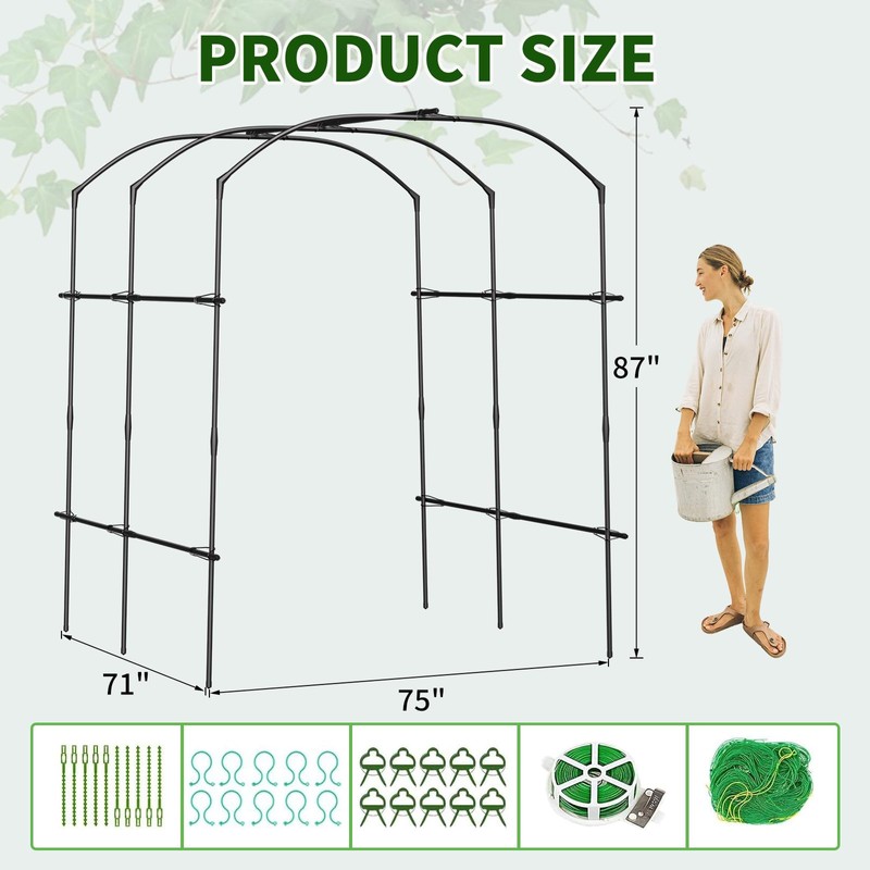 - LARGE GARDEN TRELLIS:This garden arch trellis with an arched structure measures 87×75×71Inch, designed specifically for growing climbing plants and vegetables. It can provide ample growing space so that you can maximize your harvest and yield. At the same time, it can also become an attractive archway for climbing plants to create a beautiful entry into your garden