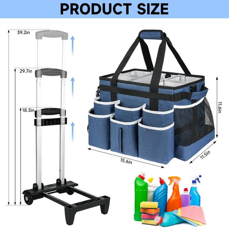 - Fourr Ways To Carry: The trolley of this rolling cleaning caddy Bag is removable, freely adjustable in height, and can be folded and stored away when not in use. It is also designed with a comfortable carrying handle, two side carry handles and a removable shoulder strap for easy carrying, making your cleaning job easier