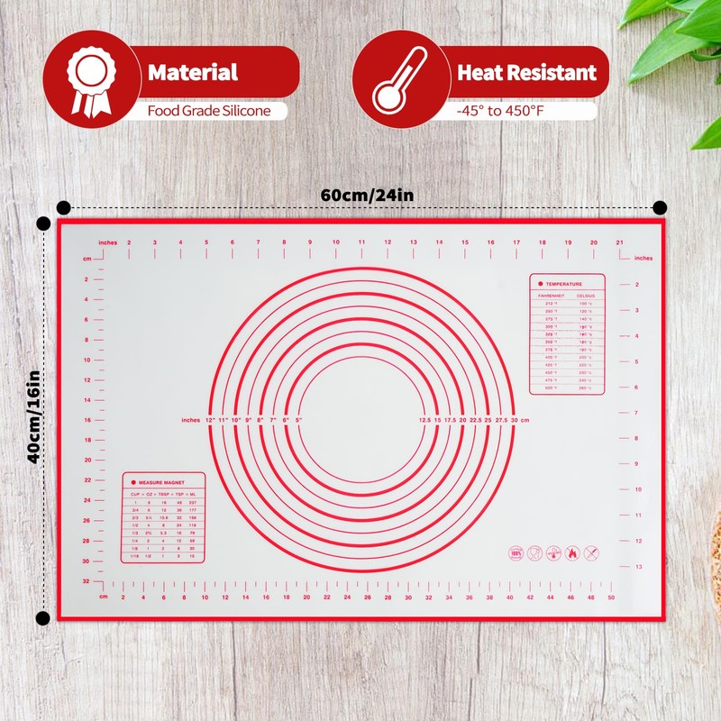 - Appropriate Size: Baking mat size: 24 x 16 inches (60 x 40 cm), suitable for most work surfaces in the kitchen or tables. Printed with measurements to help make dough to the size you want, the silicone baking sheet is also ideal for measuring the size of pizza, cookies, enough for everyday use in the kitchen