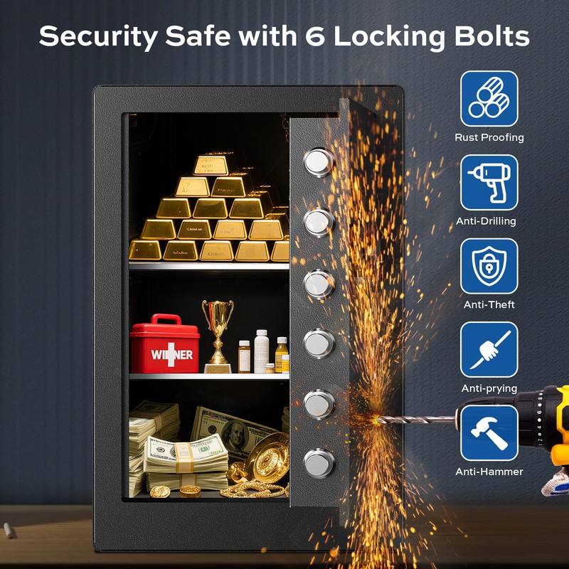 - 3.0 Cuft Security Safe Box with 6 Locking Bolts: Exterior Size: 15"x13"x23.6". Paporia Home Safe is ideal for storing your personal items such as cash, guns, medicines, A4 documents and valuables away from children or thieves. Also, wider locking bolts of four 8.6" dia can resist physical attacks, keeping your valuables safe and secure