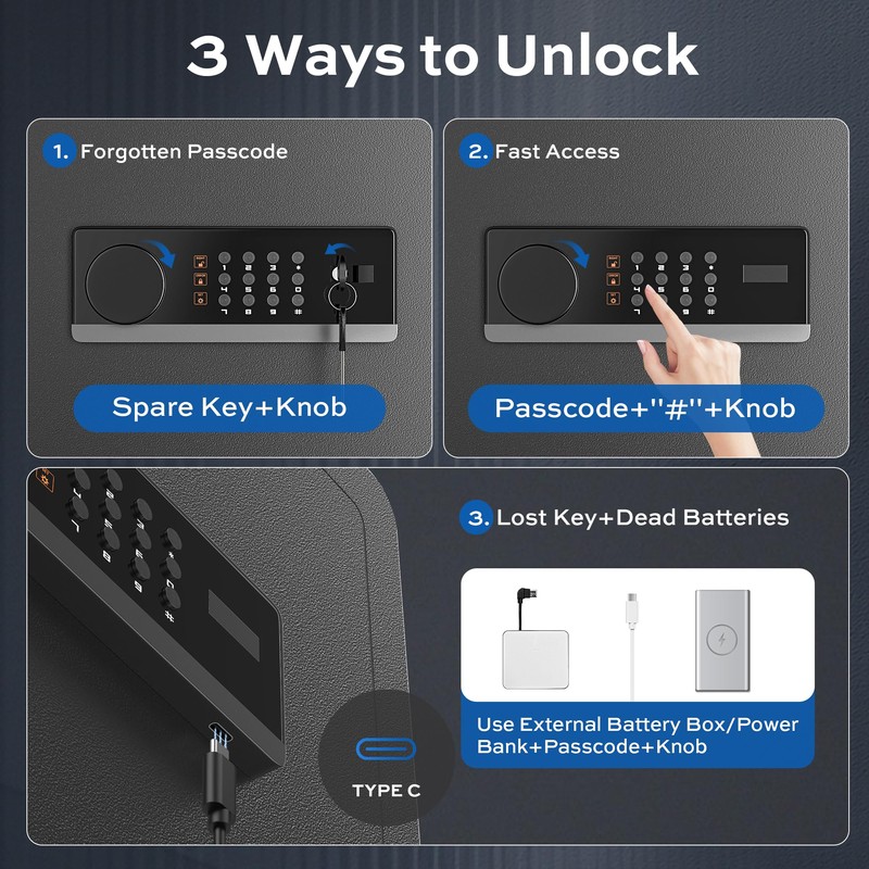 - 3 Ways to Unlock the Money Safe Box: 1) key+knob. 2) passcode+"#"+knob. 3) use external battery box/power bank+passcode+knob.(Batteries are not included) Note: When you first get the safe or forget password, use the key to open the door. Plus, each safe has a unique number on the lock cylinder. If you lose the key, you can tell us to get a new one