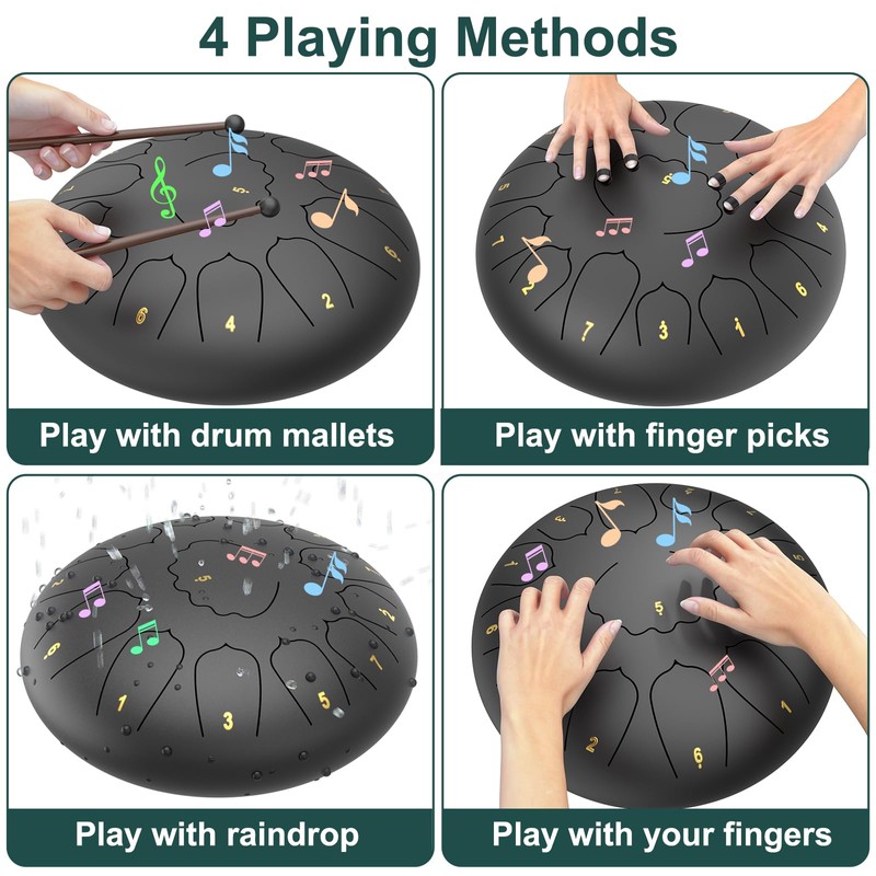 - Easy To Pick Up: Whether you're a beginner or a seasoned musician, this rain tongue drum is designed for ease of use. Simply tap the hand pan drum rhythmically with the included mallets to create enchanting melodies. With the additional music book provided, you can start playing beautiful tunes even without any prior musical knowledge. It's a fantastic choice for music lovers of all ages!