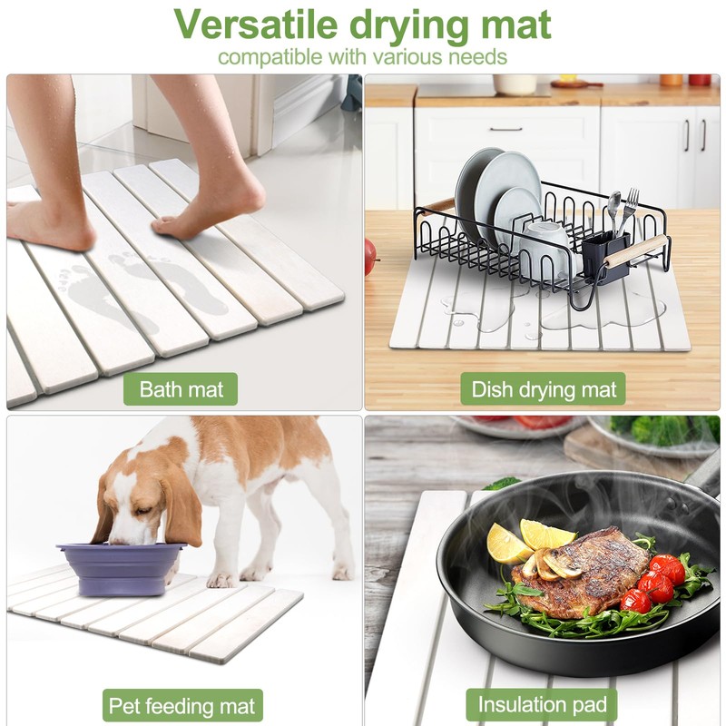 - Stone Drying Mat for Kitchen Counter: The stone drying mat made of diatomaceous earth can quickly absorb water for quick drying, keeping your countertop dry and clean. Measured 24"(L)×16"(W), this dish drying mat can be palce on kitchen countertop for drying not only dishes but also cups, utensils, pots, pans and fruits, etc. This stone dish drying mat in white is a good additon to home decors and home essentials to keep kitchen clean and organized.