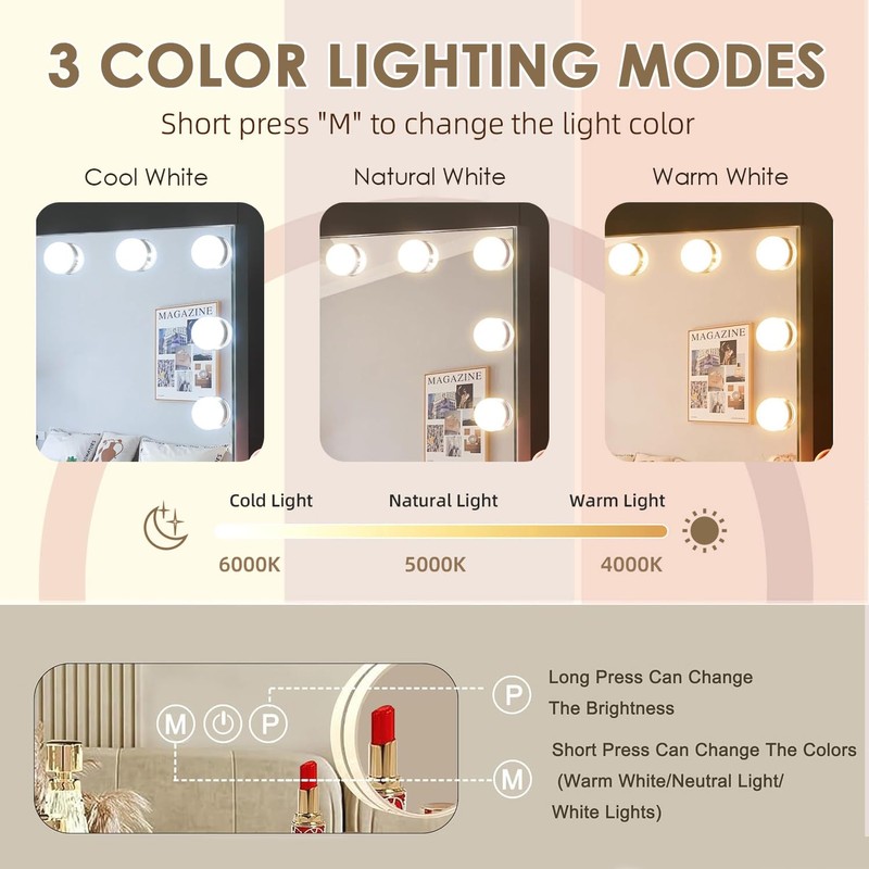 - Adjustable Brightness & 3 Lighting Modes: This Hollywood makeup mirror features adjustable LED brightness with three distinct lighting modes. Whether you're preparing in the early morning or late at night, you can customize the light to suit your makeup needs perfectly
