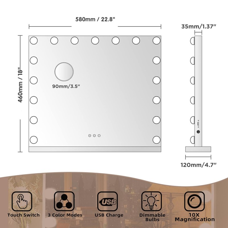 - Durable & Elegant Design: Featuring 15 long-lasting frosted LED bulbs with a 50,000-hour lifespan, this mirror is designed for continuous use without the need for bulb replacements. The sturdy base and rubber pads keep the mirror stable and prevent slippage