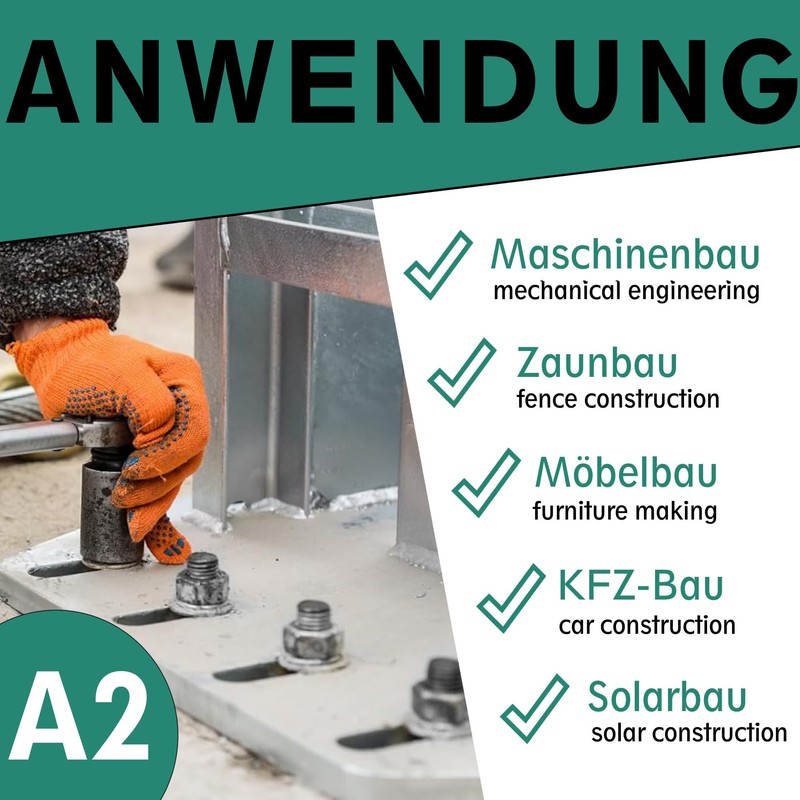 - Application area: Mechanical engineering, motor vehicles, motorbikes, fence construction, furniture etc.