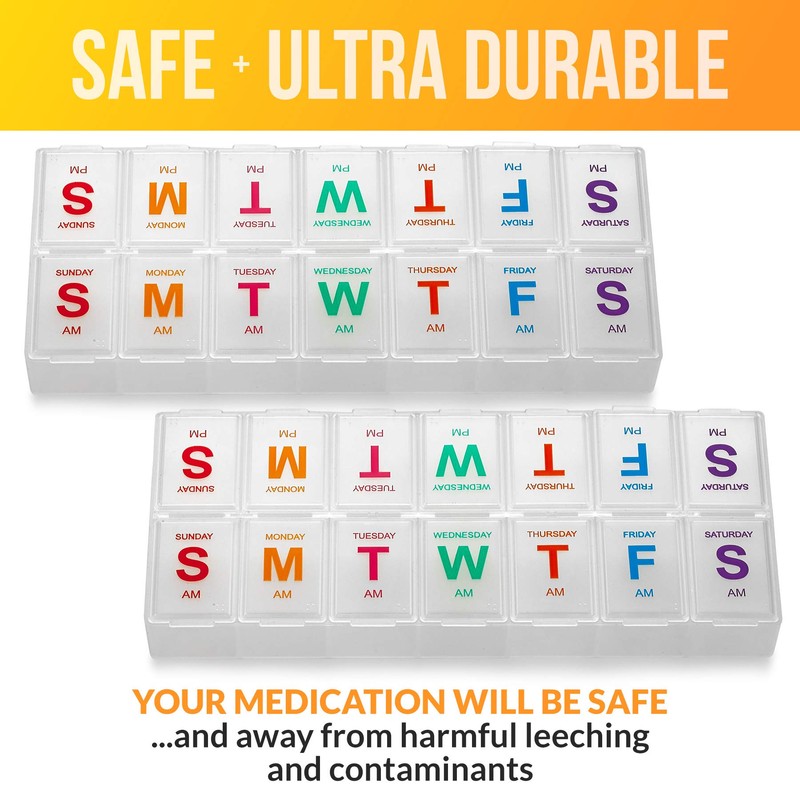 - BPA FREE! HIGH QUALITY THAT IS SAFE & ULTRA DURABLE: Our day night pill organizer is made from an extra durable plastic which means that your medication is kept safe and secure. It won’t break easily and each lid will stay securely closed. Our product is BPA FREE and NON-TOXIC. That means your medications is safe in this weekly pill organizer and away from harmful leeching and contaminants