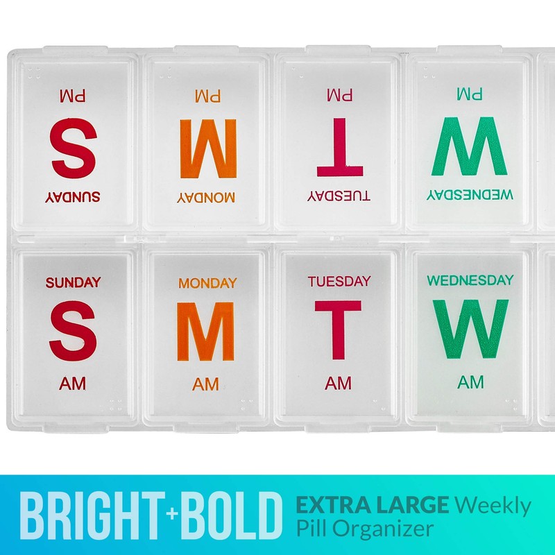 - PACK OF 2 - BRIGHT. BOLD. EASY TO READ PILL ORGANIZERS: Our pack of 2 Extra Large AM/PM - 2 times-a-day weekly pill organizer were designed so that everyone can easily read the bright and colorful markings either during the day or night. Meaning this pill box 7 day weekly organizer is great for those who have been impacted by vision loss, macular degeneration, and other impairment