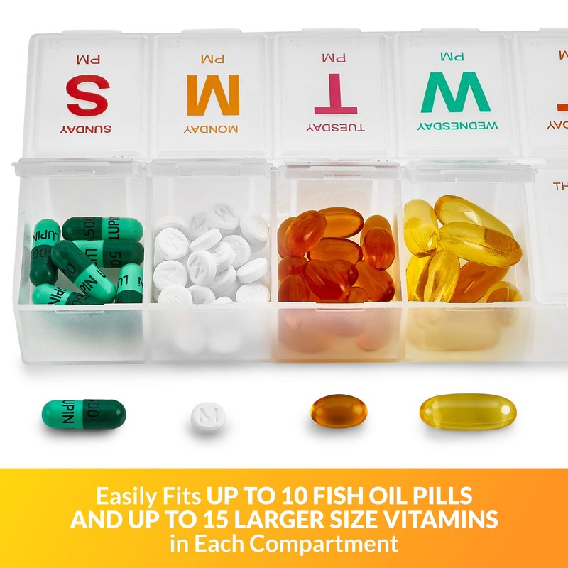 - EXTRA LARGE: With this extra large pill sorter you will no longer have to fight for room to get all your medications and supplements into one compartment. This pill caddy organizer easily fits up to 10 fish oil pills and up to 15 larger size vitamins in each compartment. The translucent lids keeps the contents visible and helps to prevent missing a dose
