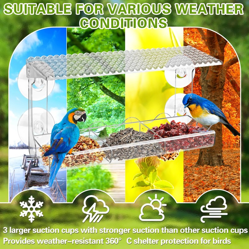 - Transparent and clear: Our window bird feeder is made of acrylic, strong and robust and not easy to break, the transparent window bird feeder provides a clear view, so you can watch the birds up close. The rainproof design on the top prevents raindrops from falling into the bird feeder and causing mold or germination of the seeds.