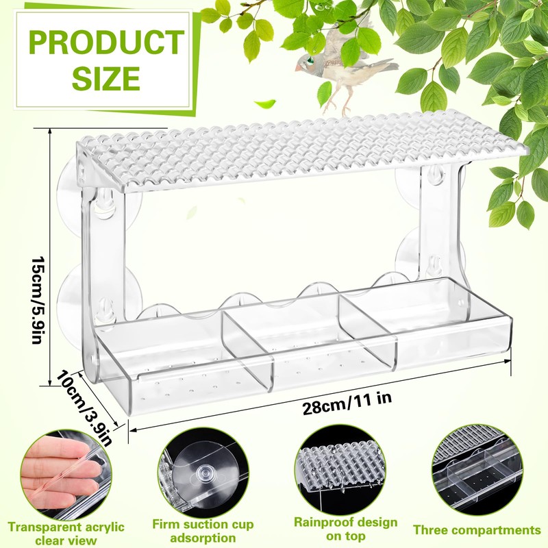 - Large capacity bird house: this bird house window measures 28 x 10 x 14.5 cm / 11.08 x 3.94 x 5.71 inches. The window bird feeder is 30% larger than the triangular feeder and can hold 500 ml of seeds, this is not necessary feed it frequently. By sprinkling bird food into the ground, the birds have more space to eat. The three compartment design can be used to pack different types of seeds, giving the birds more food choice.