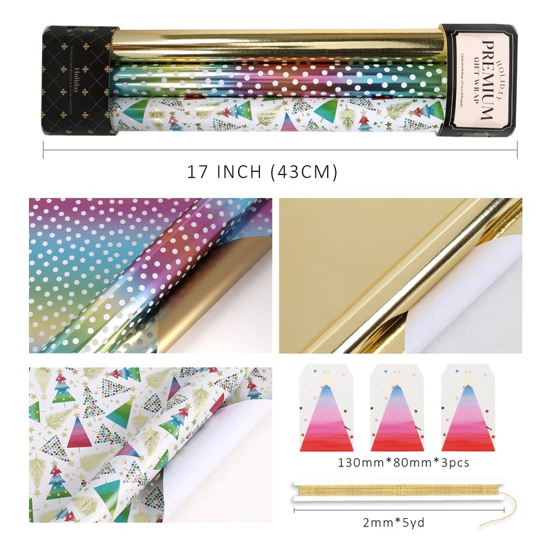 LaRibbons Foil Christmas Wrapping Paper Rolls with Gridlines, Christmas Tree Shapes/Polka Dot/Matte Gold Design for Holidays, Parties, 17 Inch 10 Feet(3 Rolls:42.3sq.ft.ttl)