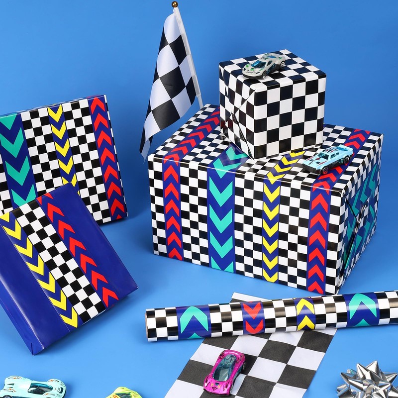- Reversible Design: This double-sided wrapping paper features a fun race track and black & white checkered flag on one side, and solid navy blue on the other—perfect for adding excitement to any celebration.