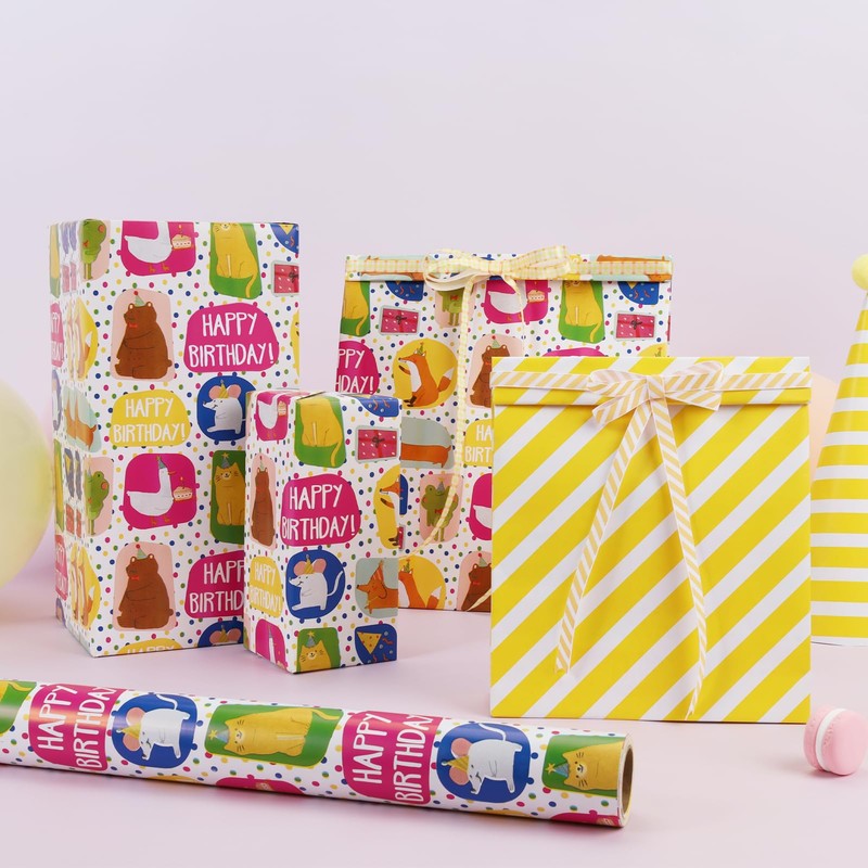 - ๐ฝ๐๐๐๐๐๐ ๐ซ๐๐๐๐๐๐: The LaRibbons Reversible Birthday Wrapping Paper features an adorable animal motif alongside cheerful yellow and white stripes, making it the perfect choice for kidsโ birthday celebrations and baby showers alike