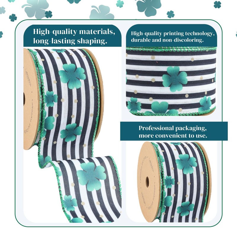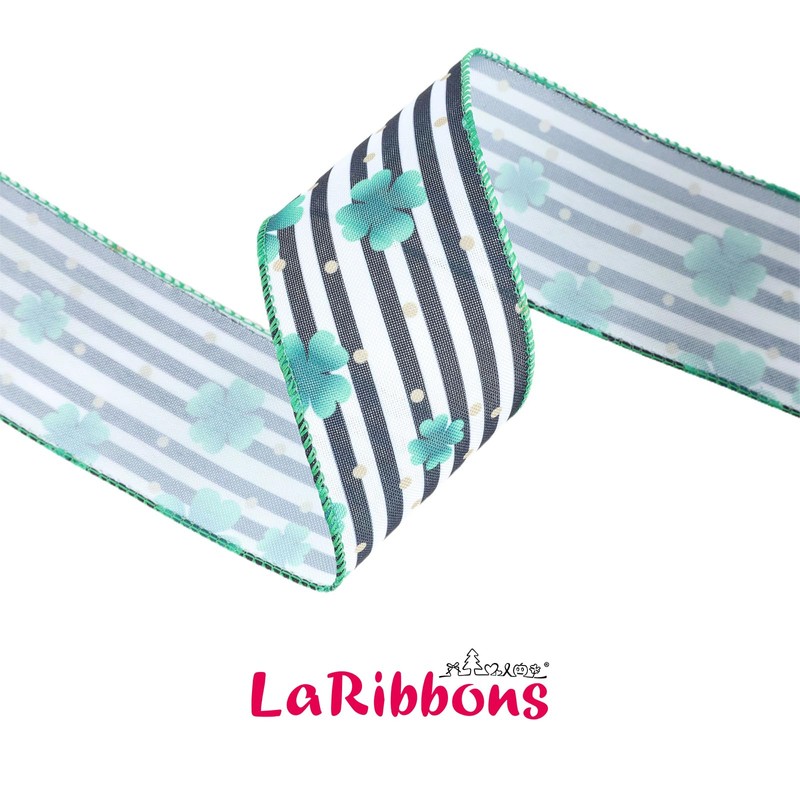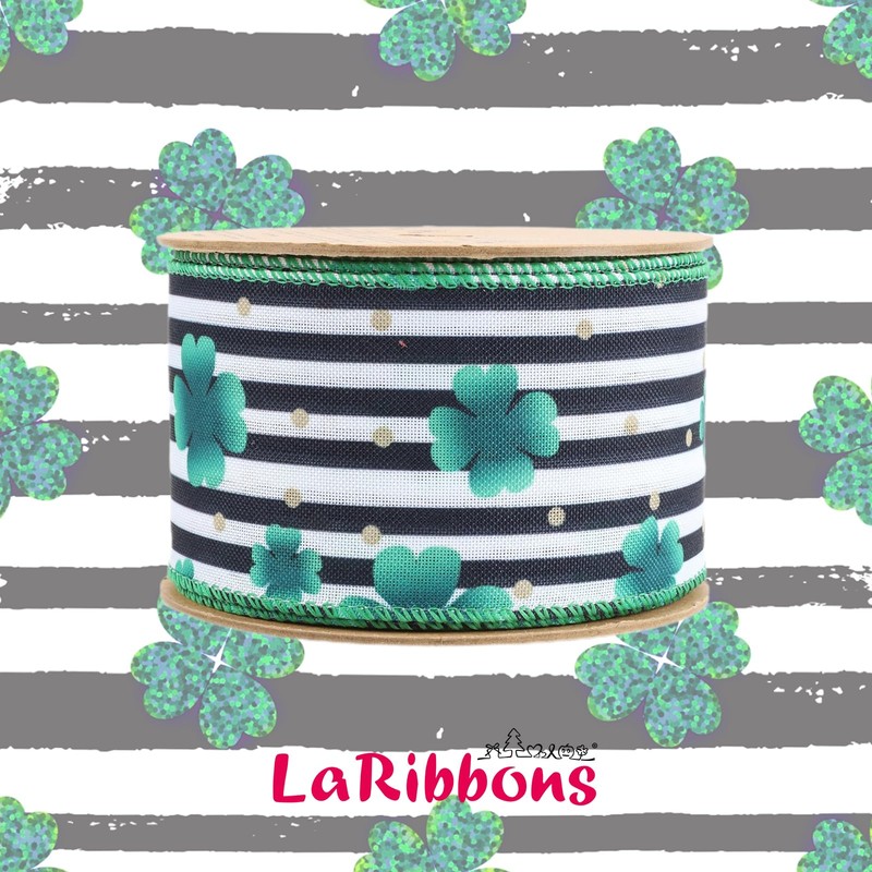 LaRibbons St Patricks Day Ribbon 2.5 Inch x 10 Yards, Green Shamrock Ribbon Wired with Black and White Striped for Crafts Wreath Bow Gift Wrapping DIY Decoration