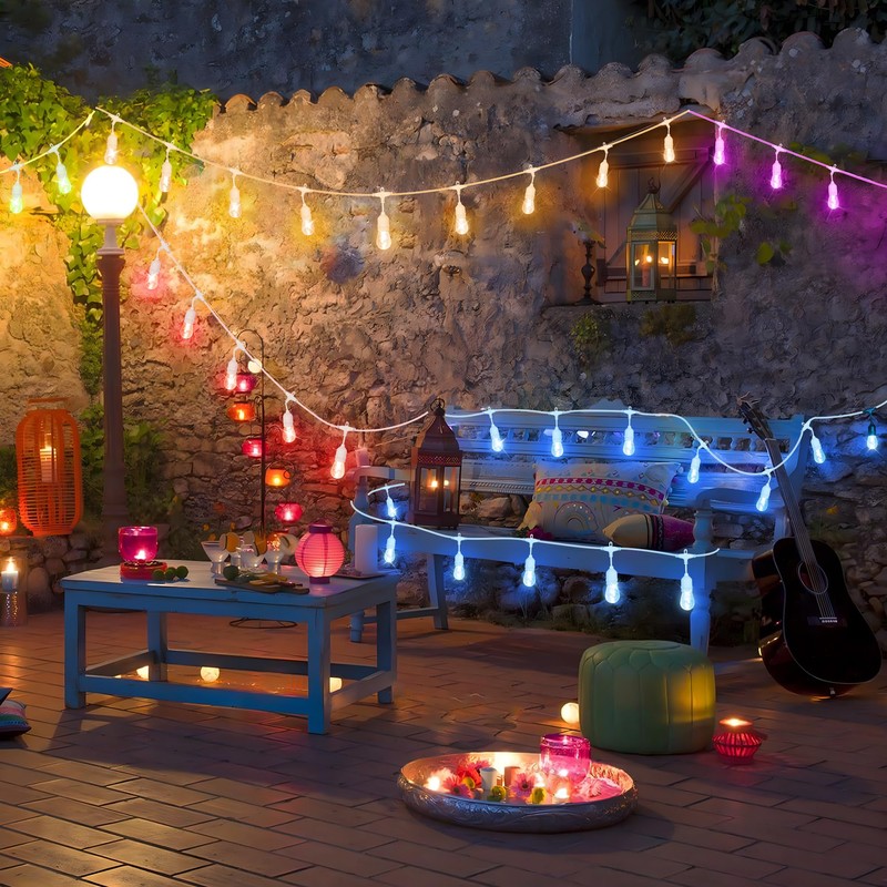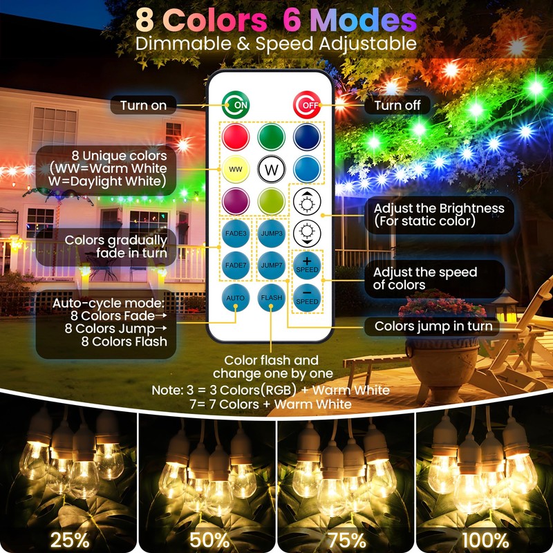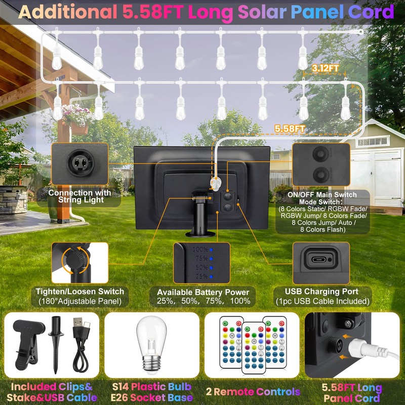 - Easy to install & Magical Ambiance RGB String Lights: Easily hang our outdoor lights in just a few minutes using cup hooks, guide wires, or ties with built-in hooks. Package includes 2 x 50FT E26 hanging sockets rgb solar lights, 34 x S14 bulbs(4 spares), 3 x remotes and 1 use manual. With a long-lasting LED bulb and weather-resistant construction, these lights are both functional and decorative, perfect for wedding, holiday, summer barbecue, birthday, Christmas party, or everyday use