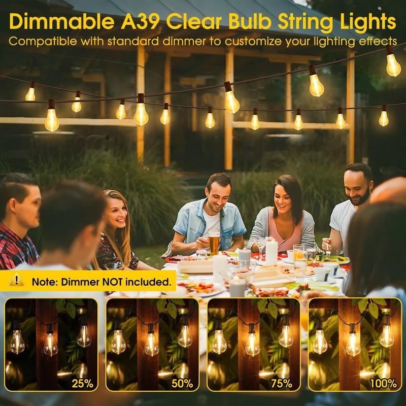 - Energy-saving & Long-lasting Use Edison Bulb Lights: Enjoy the warm white glow and energy-saving benefits of these outside hanging string lights. Our retro-style A39 bulbs have a long lifespan of over 30,000 hours, designed to save up to 90% energy compared to traditional bulbs. Won't get heat after a long time use, our cool-to-touch bulbs providing a stable and flicker-free light source for your garden, tent, and outdoor wedding celebration, perfect for permanent outdoor installations