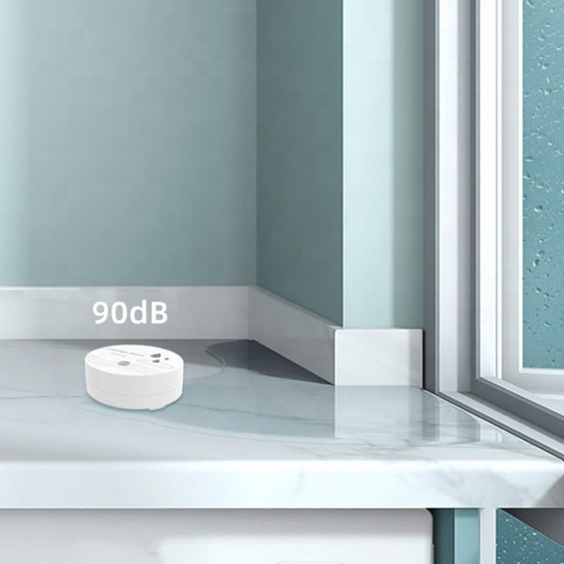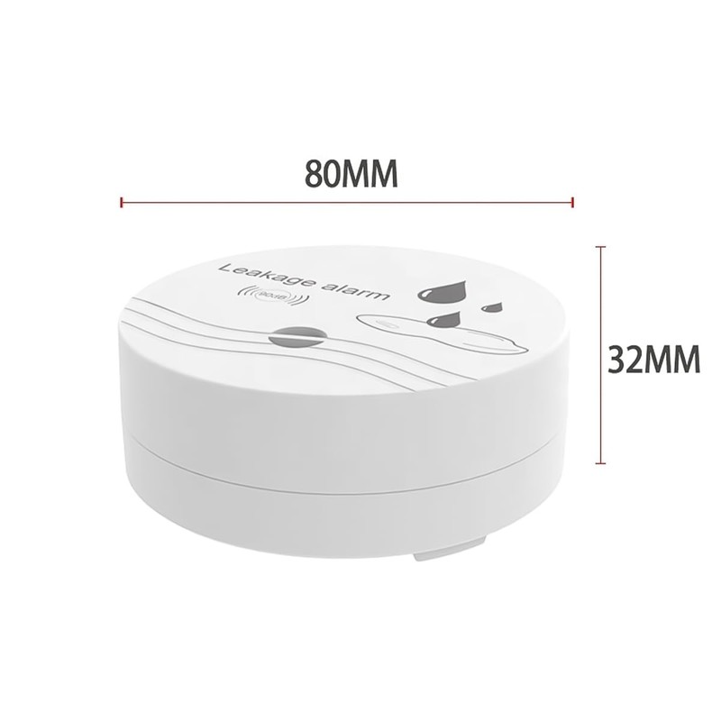 • The water leak detector has a diameter of 80 mm and a height of 32 mm and can be easily installed anywhere, such as in the basement, bathroom, under the sink or through the water heater to detect water leaks.