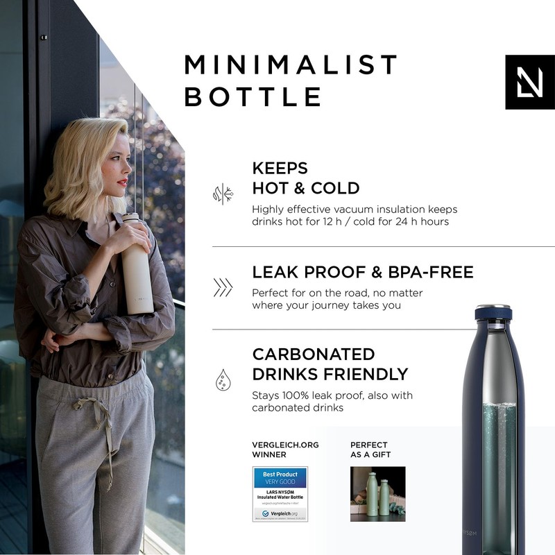 - IDEAL GIFT: The water bottle is perfect as a gift for Christmas. The sports bottle is made of high-quality 18/8 Stainless-Steel and is free of BPA. Ideal for carbonated drinks, water and juices.
