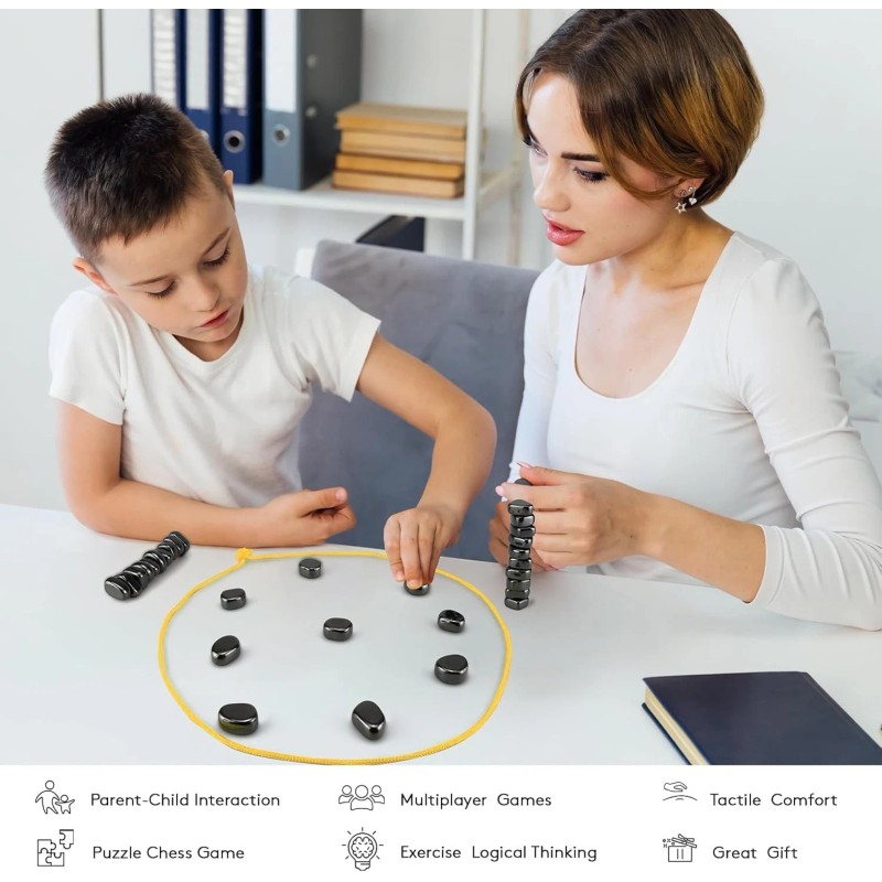 - [Magnetic Chess Game – Fun & Fast-Paced]: Challenge your skills! Simply place all your magnetic pieces inside the rope circle and avoid them sticking together to win. It’s a quick and fun game that the whole family can enjoy.