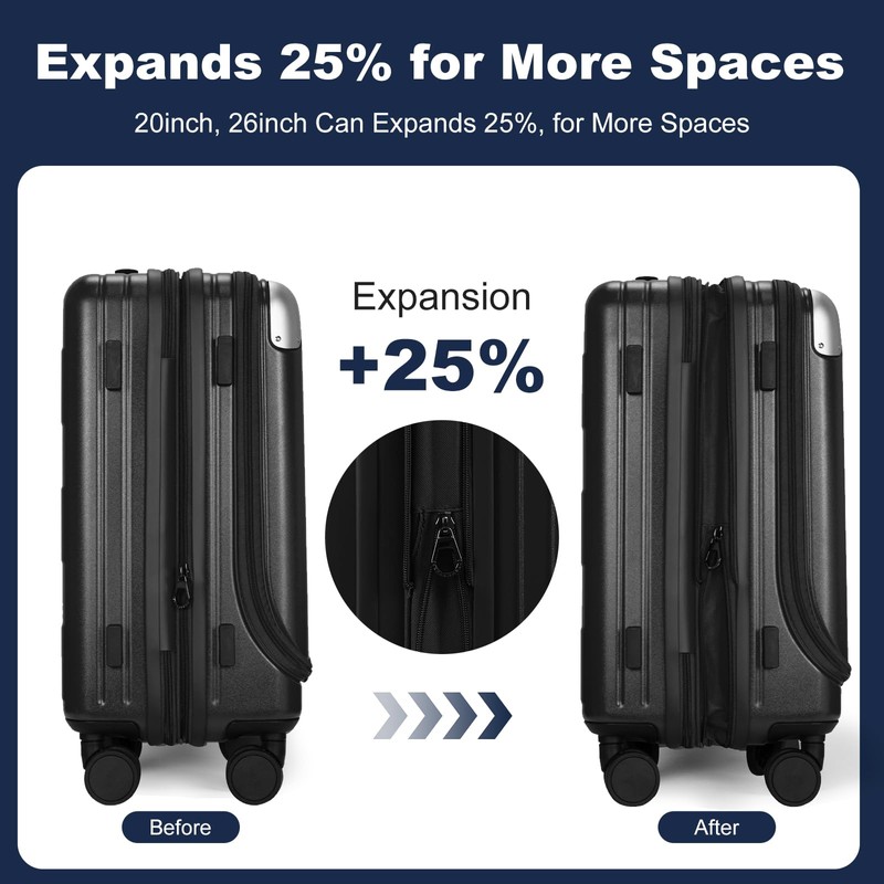 - Full Size Expandable: Experience the convenience of additional packing space with a separate expandable zipper, this carry on suitcase sets 2 piece provide 25% more capacity. Perfect for stowing away souvenirs during your return trip. The dual wheels operate quietly and provide stability, ensuring a smooth and stable travel experience