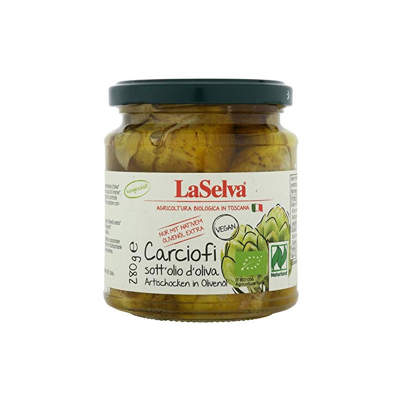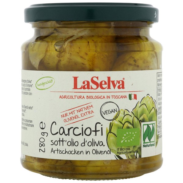 Processing: Naturland Fair certified. Our "Carciofi" in extra virgin olive oil are an excellent product and prepared according to the Tuscan tradition. Only the best fruits are processed. Whole artichokes are peeled in our factory, then blanched in water and vinegar and placed in extra virgin olive oil to retain the intense taste. Processing/preparation: enjoy the artichokes as an appetizer or side dish. The pickled fruits are an excellent ingredient for fine pizzas and salads or as a side dish to meat and fish. Certification/en * EU organic seal
