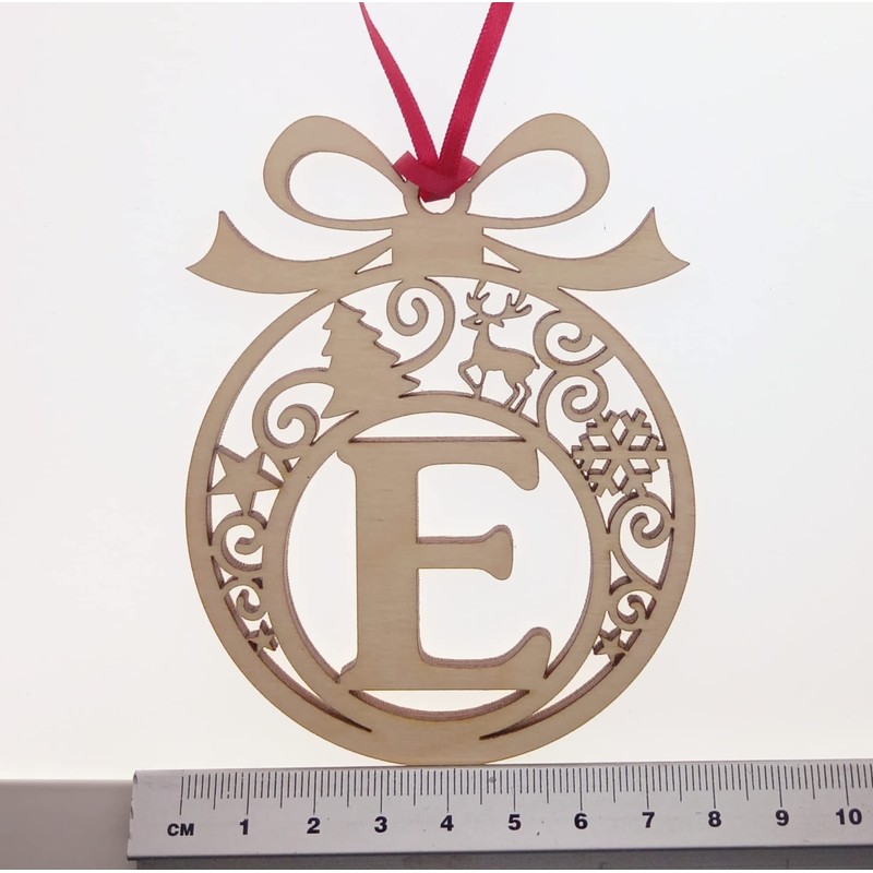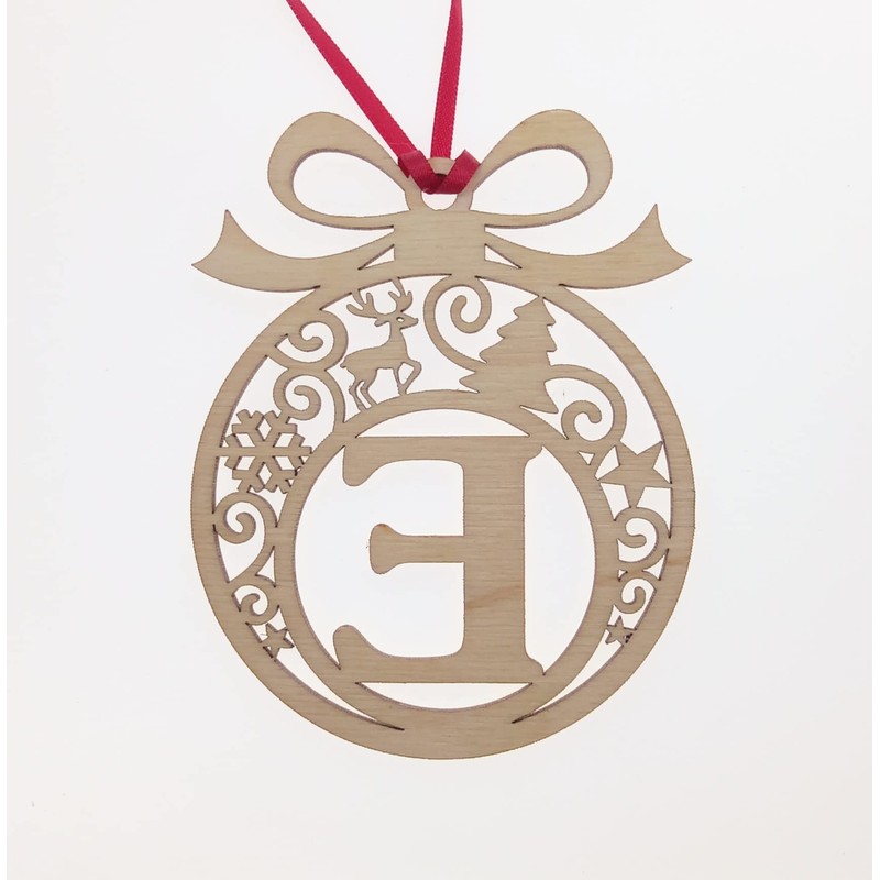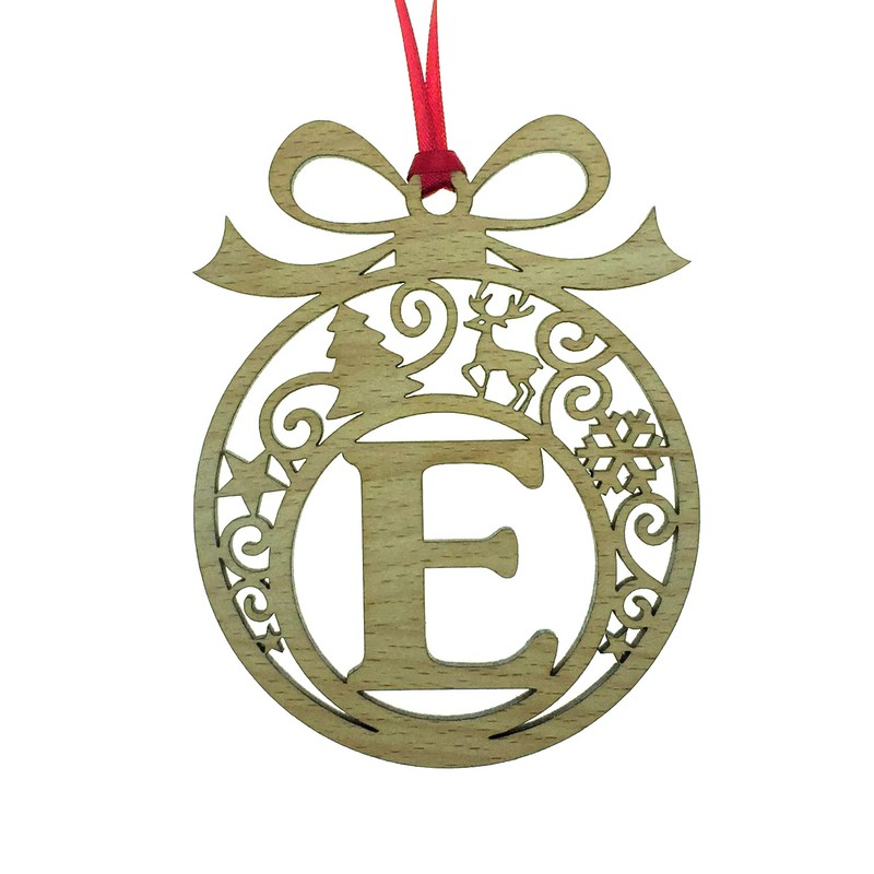 Christmas tree decoration in traditional bauble shape, with the initial "E" cut in the centre of a filigree festive scene. Threaded with red ribbon to hang from the tree.