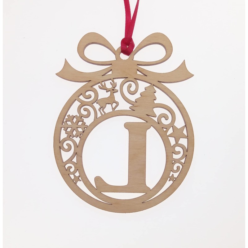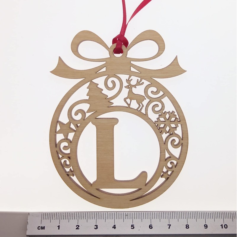 Christmas tree decoration in traditional bauble shape, with the initial "L" cut in the centre of a filigree festive scene. Threaded with red ribbon to hang from the tree.