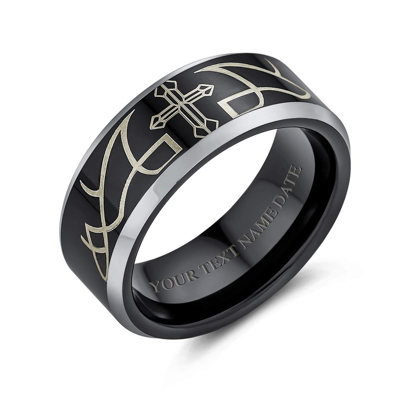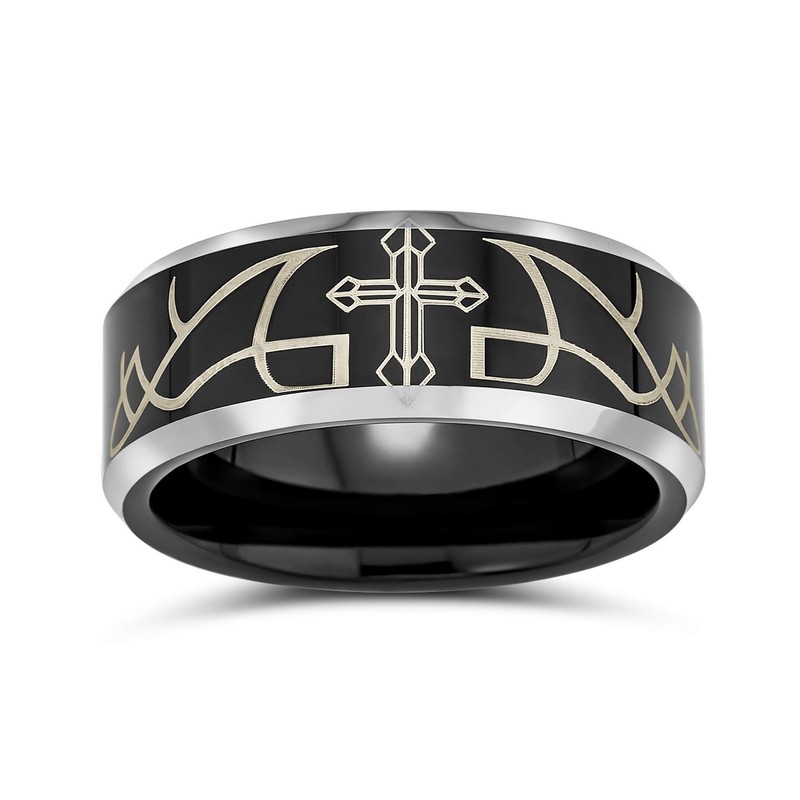 Laser Etched Catholic Religious Black Christ Thorn Cross Titanium Band Ring for Men Comfort Fit 8MM