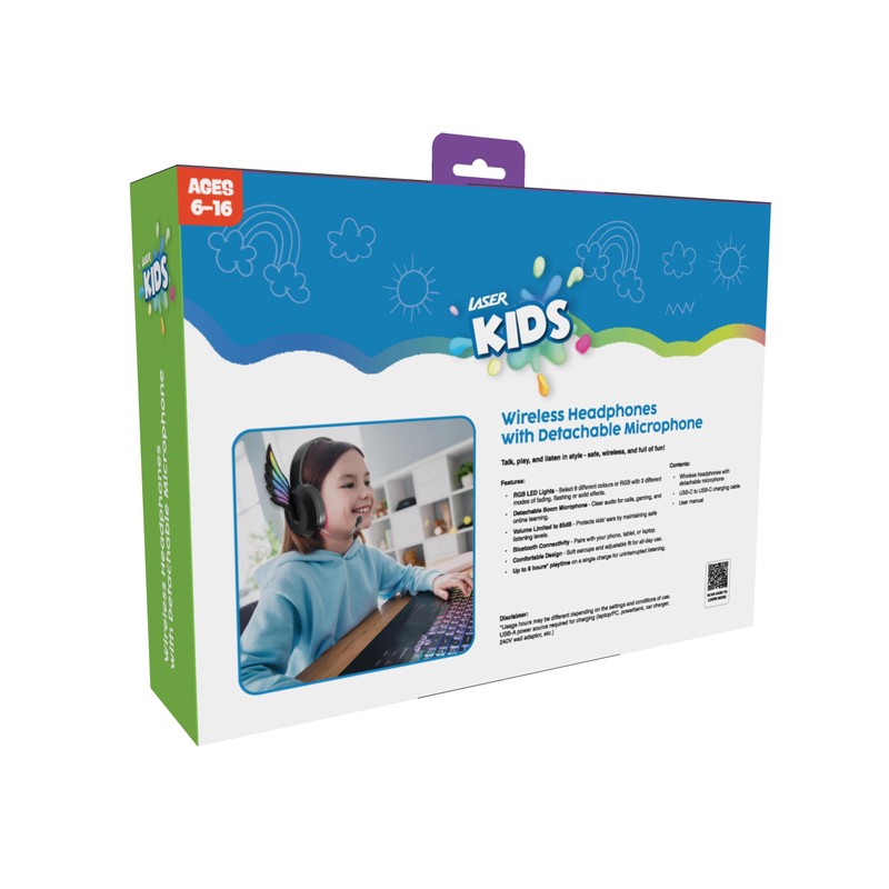 Laser Kids Angel Wings Wireless Headphones with Detachable Microphone are the perfect companion for young music lovers, gamers, and online learners. Designed with fun, safety, and comfort in mind, these headphones provide vibrant LED lights and clear sound while protecting your child’s hearing. Perfect for music, gaming, or virtual classes, the Laser Kids Angel Wings Headphones are versatile and reliable.