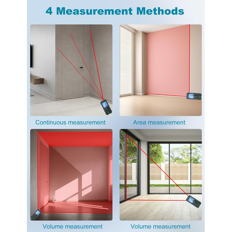 - 【Multifunctional】--This laser distance meter equipped with advanced laser technology,can accurately measure distance, calculates area, volume, and Pythagorean. While M/in/Ft/ft+in unit switching adapts to diverse measurement needs.