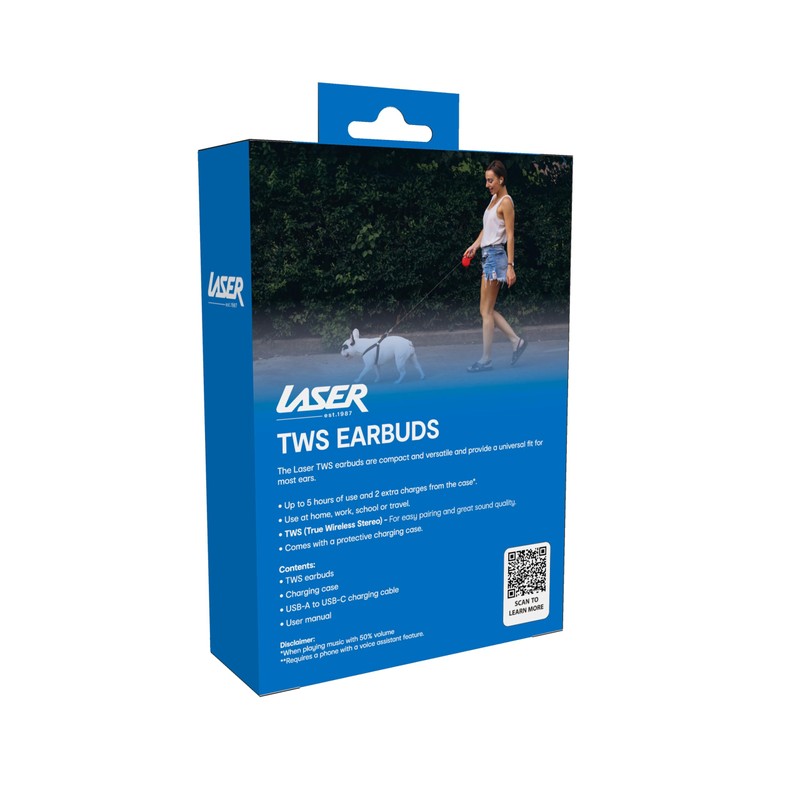 Laser TWS Earbuds White, Wireless, Bluetooth, Charging case, Voice Assistant