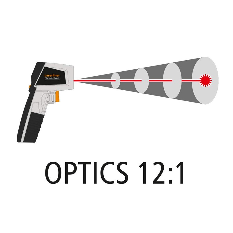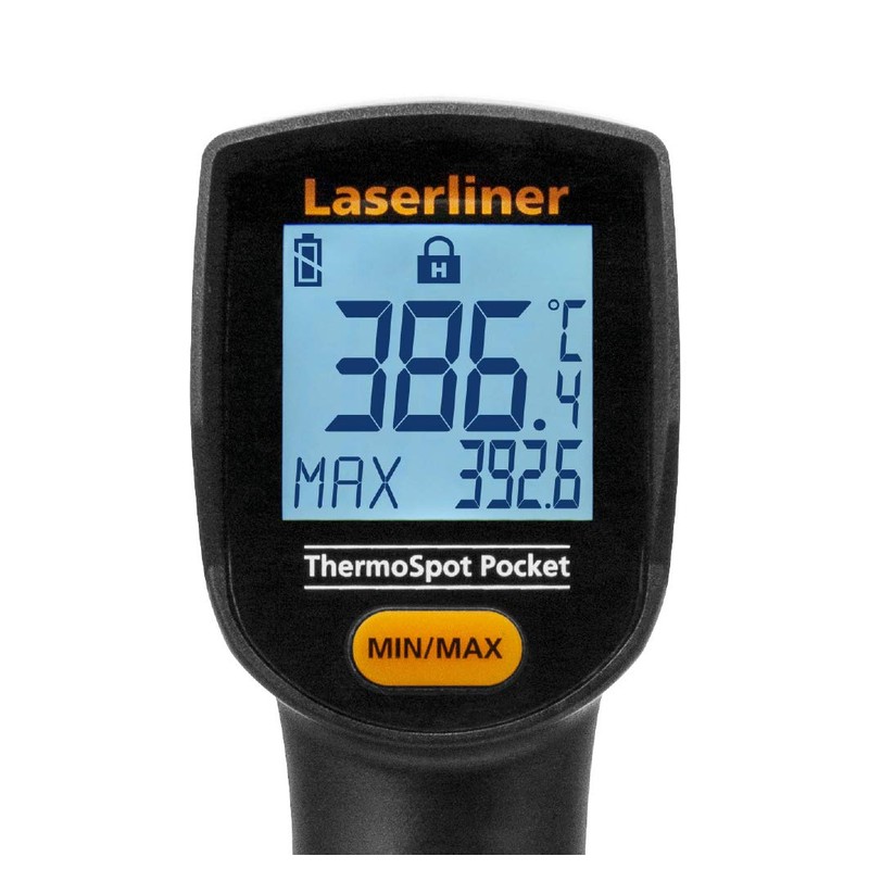 - With the target laser, the test area can be clearly targeted. The last measured value is stored via the auto-hold function