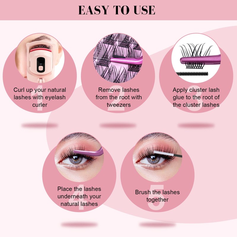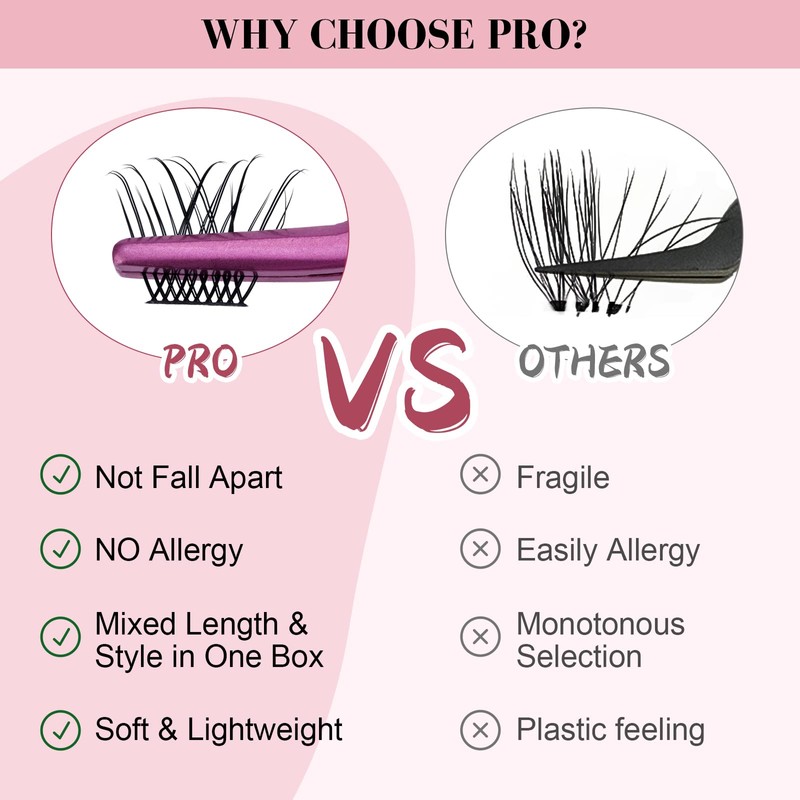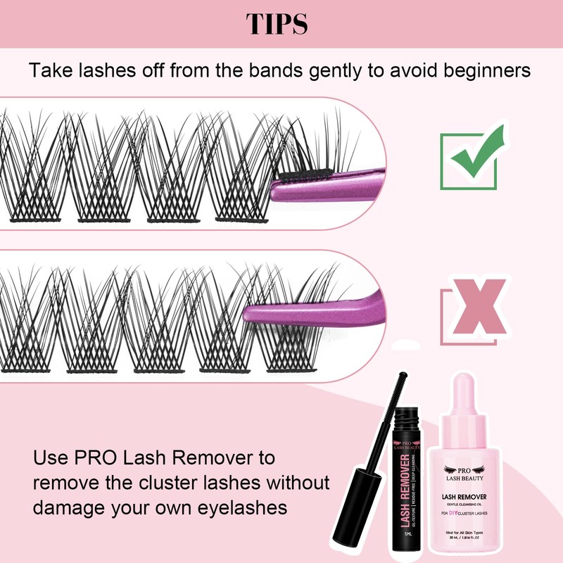 - Bring salon to your home: Pro LashBeauty Lash clusters are easy to apply. Divided individual Lashes into sections, easy to pick up and apply by yourself. You can apply the eyelashes with different lengths and styles according to different occasion. Save money from doing eyelash extensions. You will become a master of DIY lash extensions with a little practice!