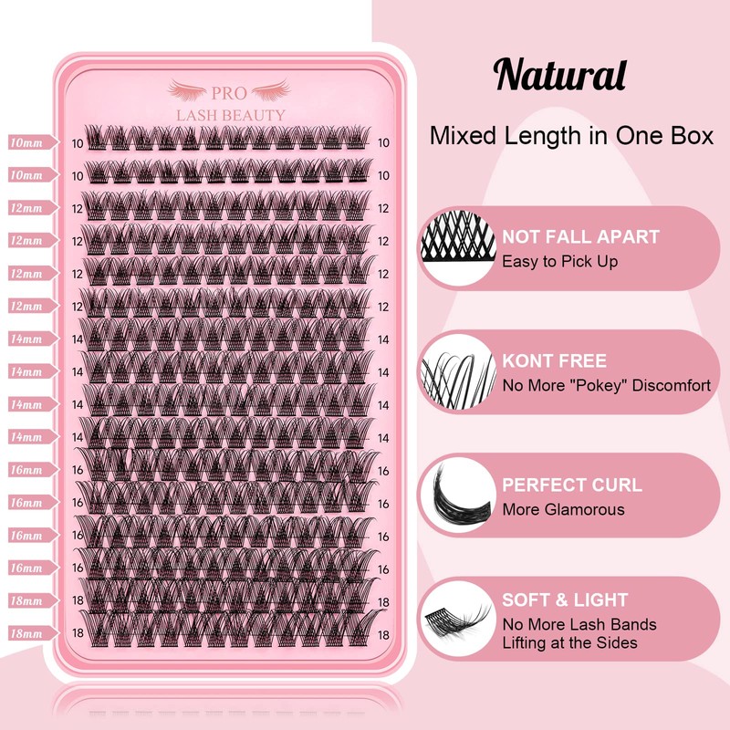 - 192 Pcs Cluster Lashes: The hottest Cluster lashes among the social media are avaiable now! Different from other brands, PRO LashBeauty can provide 192 pcs in one tray! Mix Length from 8mm to 16mm. Same Price you can get more lashes and use more times.