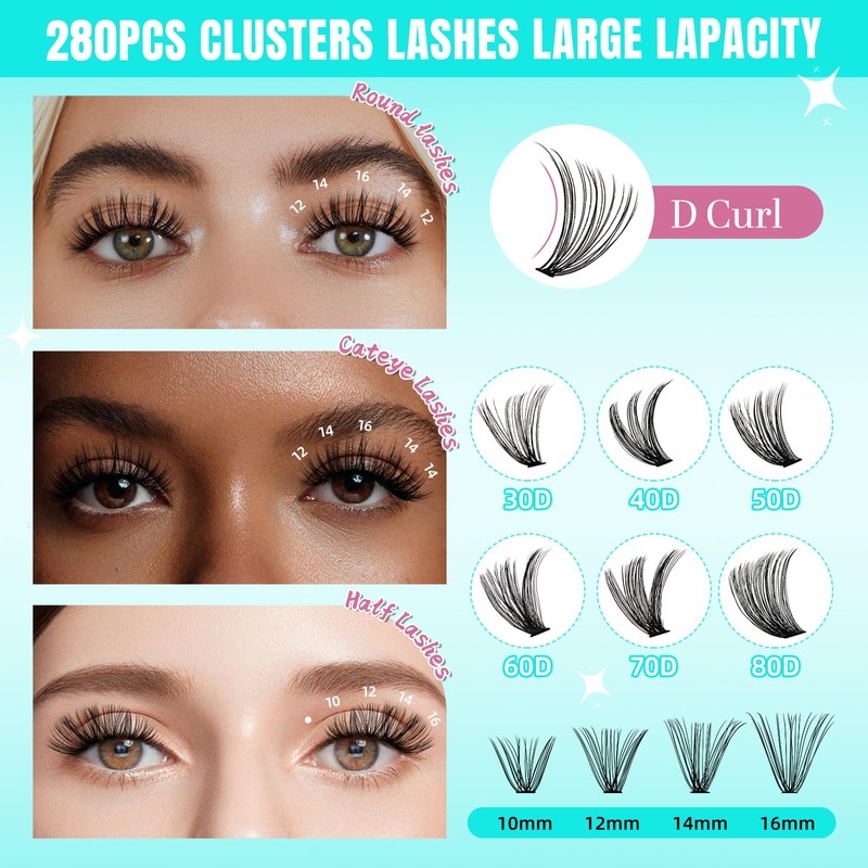 - 【You will get】AMZGlRL provide 280Pcs 30D lash clusters in one tray. based on your preferences and desired cluster eyelash extensions visual effects,you can diy at home instead of salon, save more money and time for makeup, more convenient.