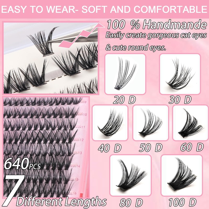 Lash Clusters, 640 Pcs Eyelashes Cluster Extensions 9-16mm Flufffy Individual Lashes 30D-60D D Curl False Eyelashes (30D~60D Kit 9-16 mm)