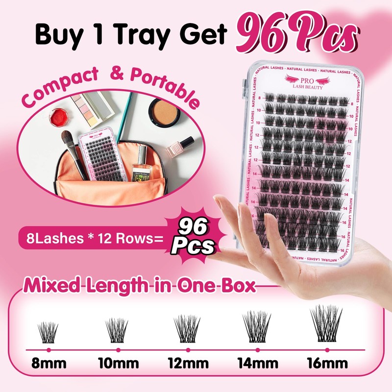 • 96 Pcs Cluster Lashes: The hottest Cluster lashes among the social media are avaiable now! Different from other brands, PRO LashBeauty can provide 96 pcs in one tray! Mix Length from 8mm to 16mm. Same Price you can get more lashes and use more times. Same Price you can get more lashes and use more times.