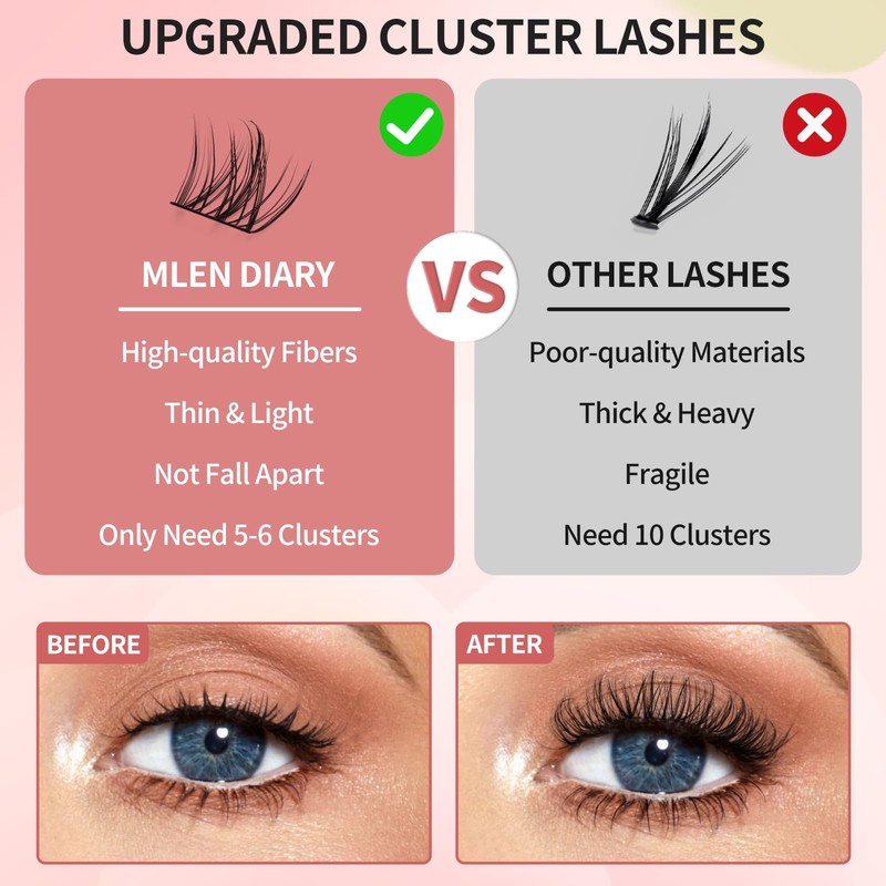 - 【D Curl Volume Fluffy - Suitable for All Occasions】Each cluster is fluffy and volume, with a perfect D-curl curve that magnifies the eyes more effectively. These eyelash extensions are the perfect companion for work, shopping, professional shooting, travel, party, etc. Effective eyelashes will double your beauty. MLEN DIARY's eyelashes can achieve the quality of a salon, so would you refuse a beautiful eyelash?