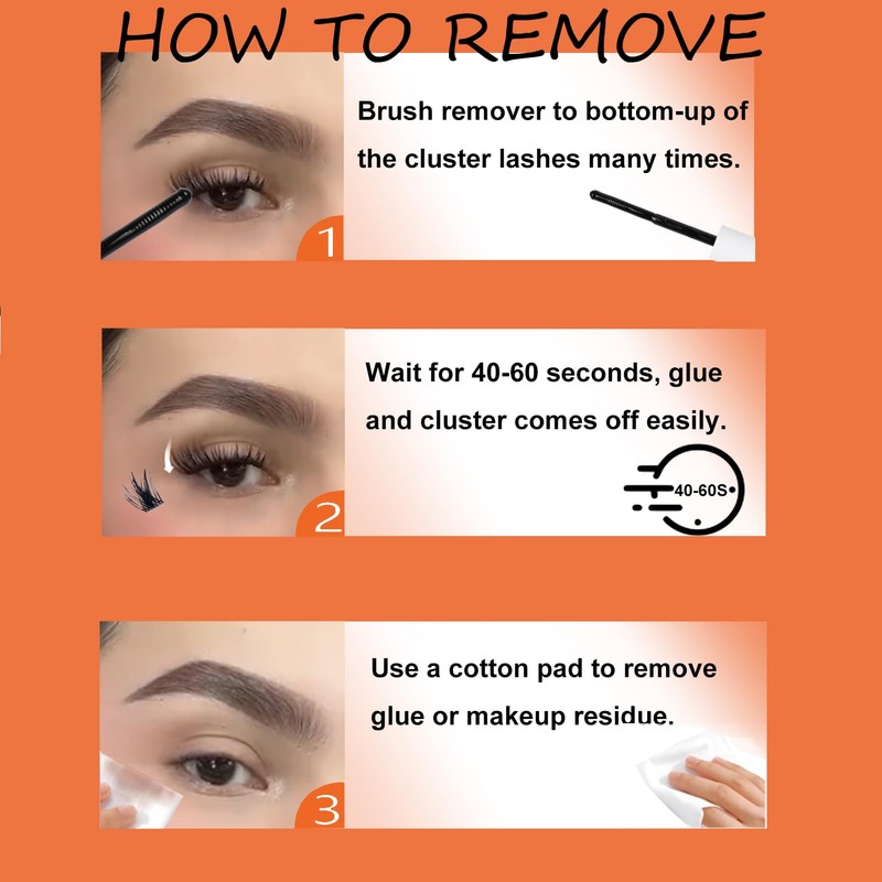 - Quick Remove Process: Brush the lash remover from the root to the tip evenly, and apply more on the root. Gently brush lashes after waiting for 40-60 seconds then the cluster lashes can easily fall off.