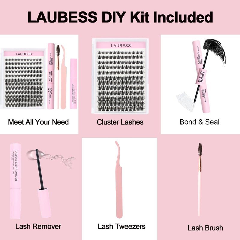 Lash Clusters Kit LAUBESS Cluster Lashes Wispy DIY Lash Extension Kit with Lash Bond and Seal Remover Tweezers Brush (Set Magic-0.07D-8-16Mix)