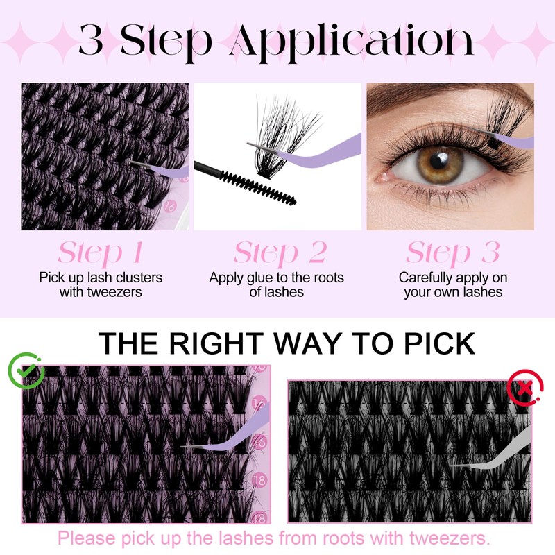- Simple Application: Effortlessly tweeze clusters from the root using lash tweezers; they hold their shape. Apply adhesive to the base, then gently attach underneath your natural lash line for a comfortable, barely-there feel.