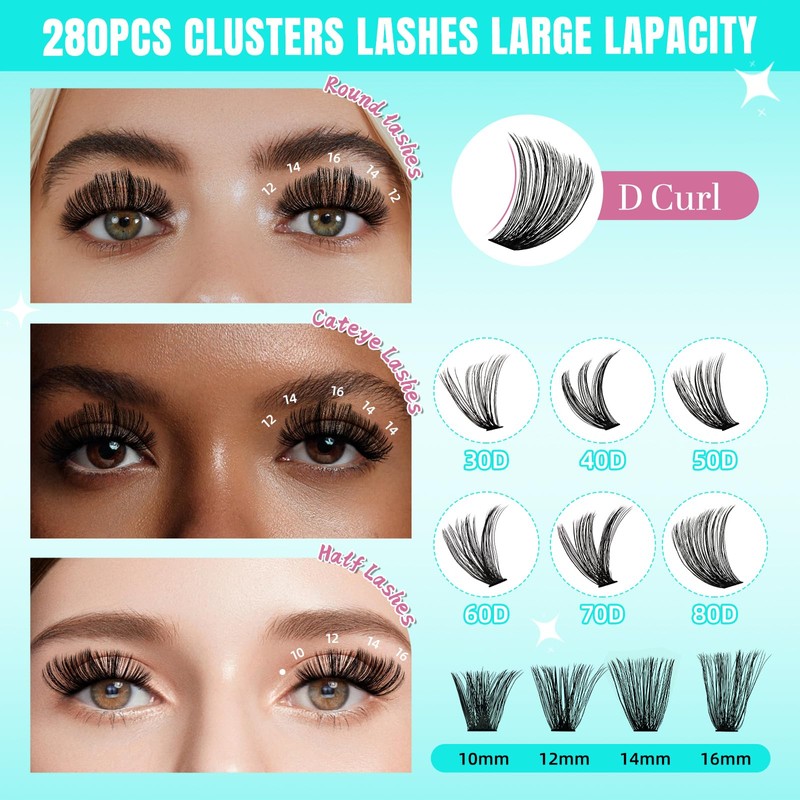 - Wispy Lash Clusters: 280PCS 80D-14MM individual lashes in one tray. Each lash extension is processed with fine craftsmanship to ensure its natural fit. Easy to put cluster eyelash extensions on, gorgeous results, and lash clusters are not easily fall apart. You can freely match it according to your needs and create different beautiful looks as you wish.