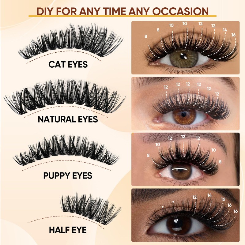 - DIY Your Own Lash Extensions: These eyelashes clusters offer incredible flexibility, allowing you to create a variety of eyelash looks. Everyone's eye contour is slightly different, and you can use different lengths of lashes to create more style possibilities, cat-eye, fan-eye, doll-eye, natural, fluffy and more. Different styles of lash extensions can be used to add highlights to daily makeup. These individual lashes can be combined to achieve your desired lash style.