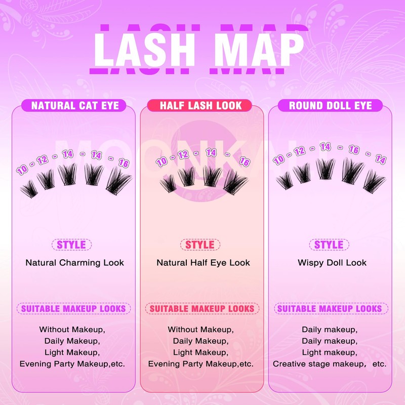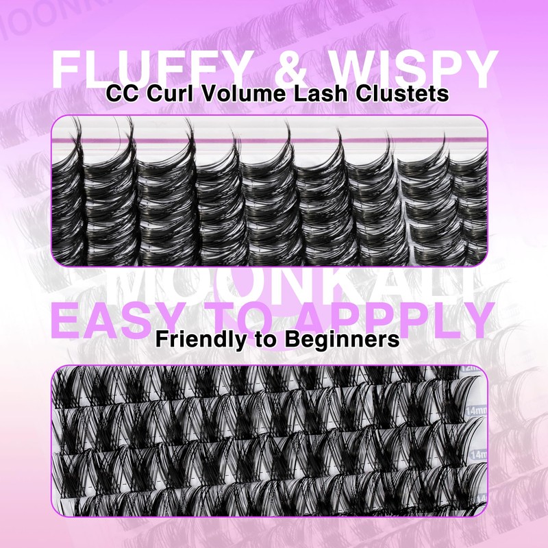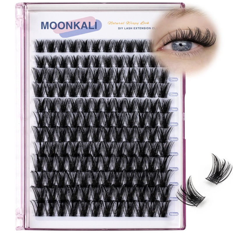 - Versatile 10-16MM fluffy lash clusters: Moonkali's d curl lash clusters have a length range of 10-16MM, allowing for seamless pairing with diverse eye shapes and personal styles, making them a go-to choice for all makeup enthusiasts