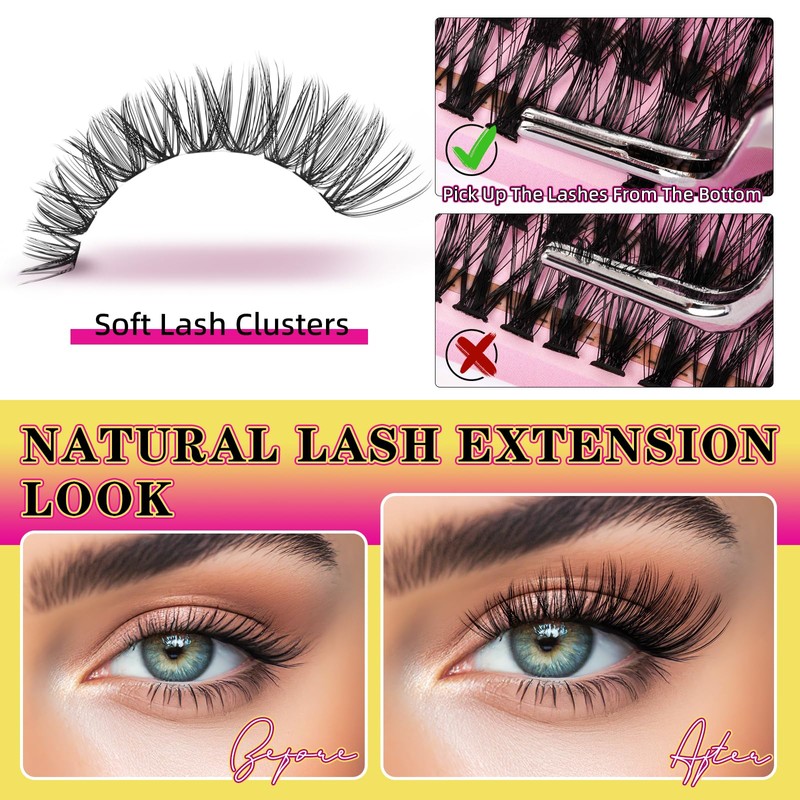 - Beginner-friendly Lash Kit:1.Curl and comb your natural lashes gently. 2.Brush a thin layer of lash bond under your natural lashes. 3.Pick up lash clusters from the root. 4.Apply cluster lashes under natural lashes 1-2mm away from the eyelid.