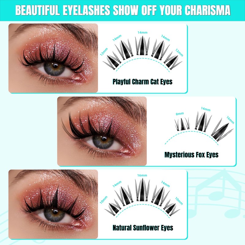 Unique 3D multi-angle cross design,interesting lash clusters from any angle,DIY individual lashes cluster soft and pine,more playful!Ultra-thin eyelashes,immediate use from the rim,very natural,non-plastic feeling.Cotton bands feels so natural,comfortable,soft and lightweight.