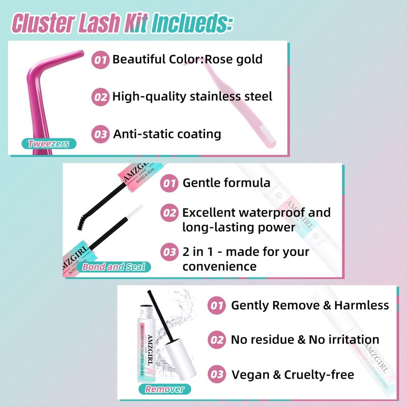 - 【Long Lasting & Soft】AMZGlRL lash glue is specially designed for DIY lash extensions at home. The unique formula gives the eyelash bond long-retention holding power. And lock the beauty by seal the cluster lashes in place. You can apply silk lash clusters in ascending order which gives a nice cat-eye effect.AMZGlRL eyelash extensions adopted the 3d faux mink lashes material, more soft and lightweight natural eyelashes.