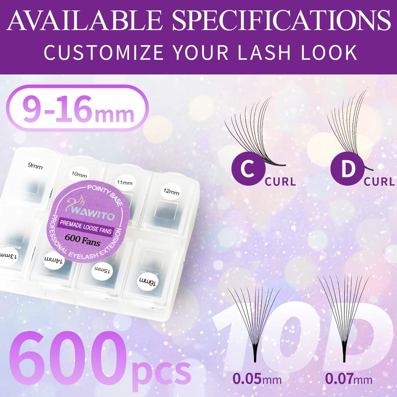- Specifications:WAWITO offer premade lashes and 600 fans loose fan(Quantity +-2%). Mega volume & dramatic effect, feel free to choose any style you like. 5D 6D 7D 8D 9D 10D 12D 14D 16D 20D, 0.03/0.05/0.07mm thickness, C/D curl, 8-15mm length.