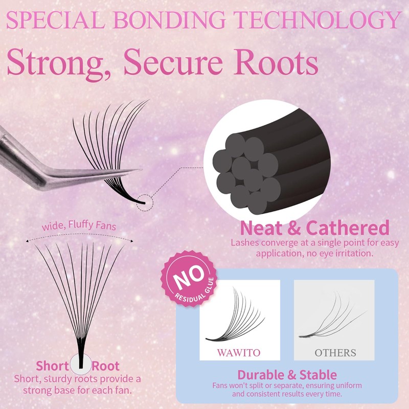 - Premium Material: WAWITO eyelash extension premade fans are handmade and use Black PBT Material imported from Korea. It is extremely soft and light, and super easy to pick up. We promise no animal test on any of our products.